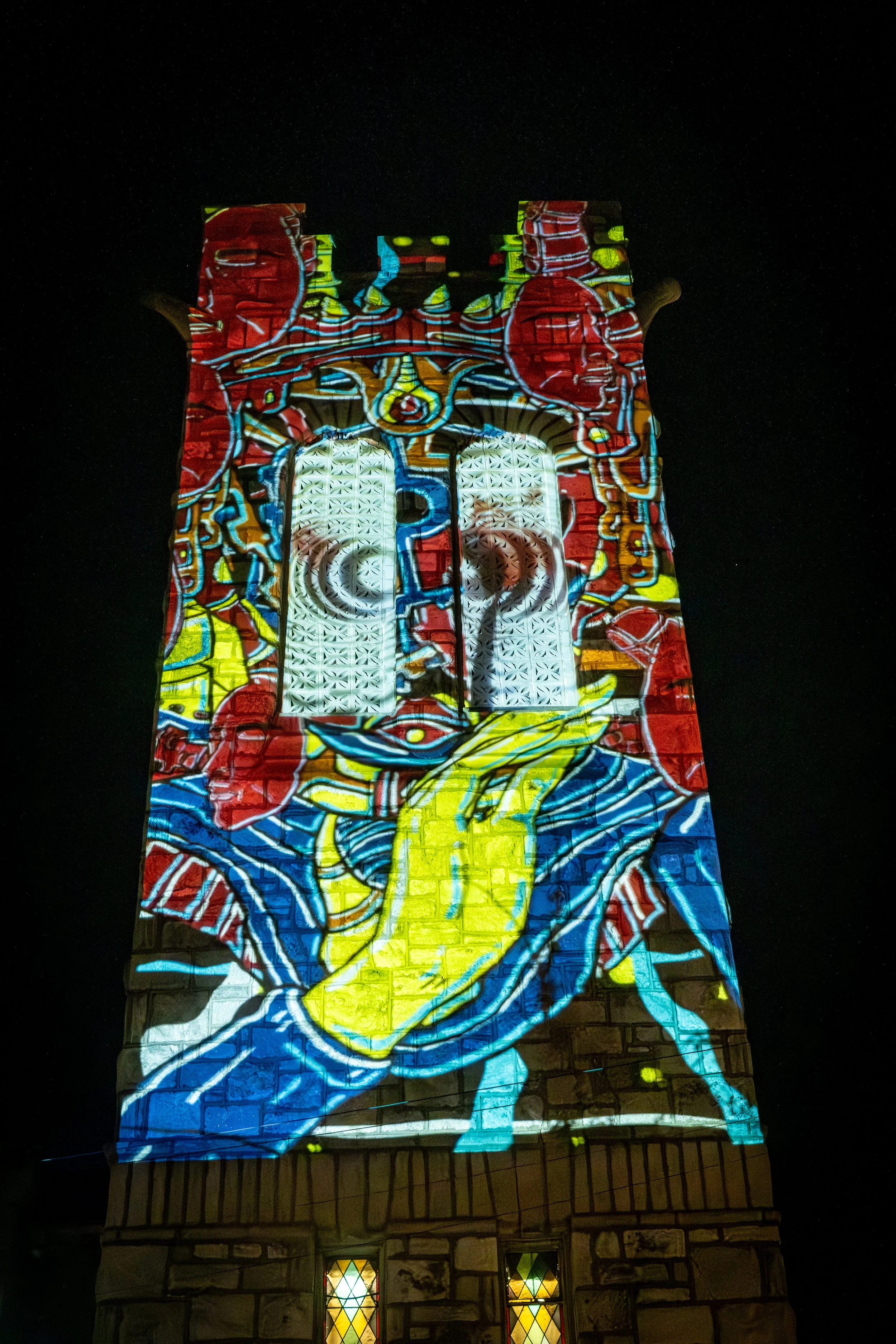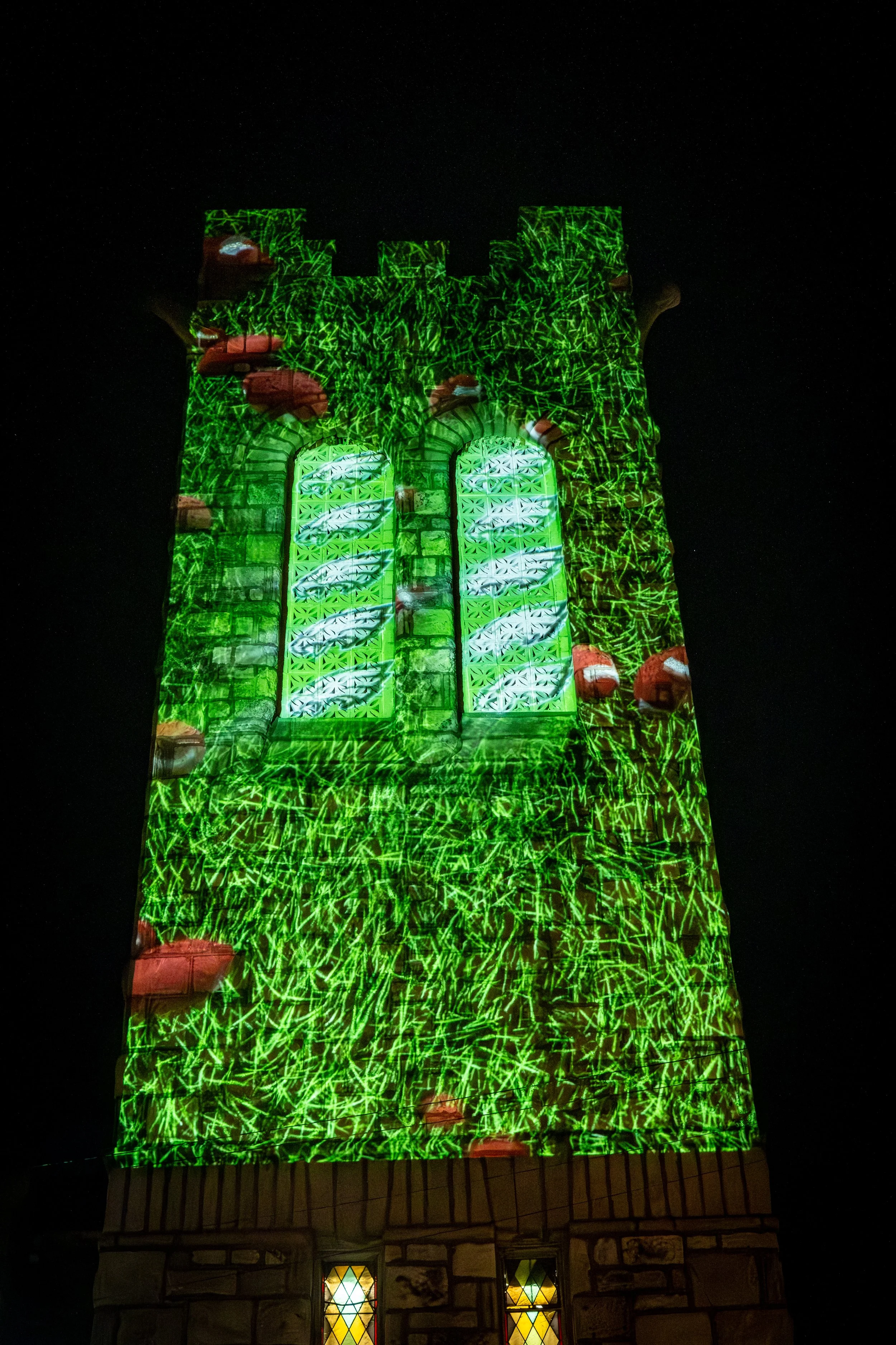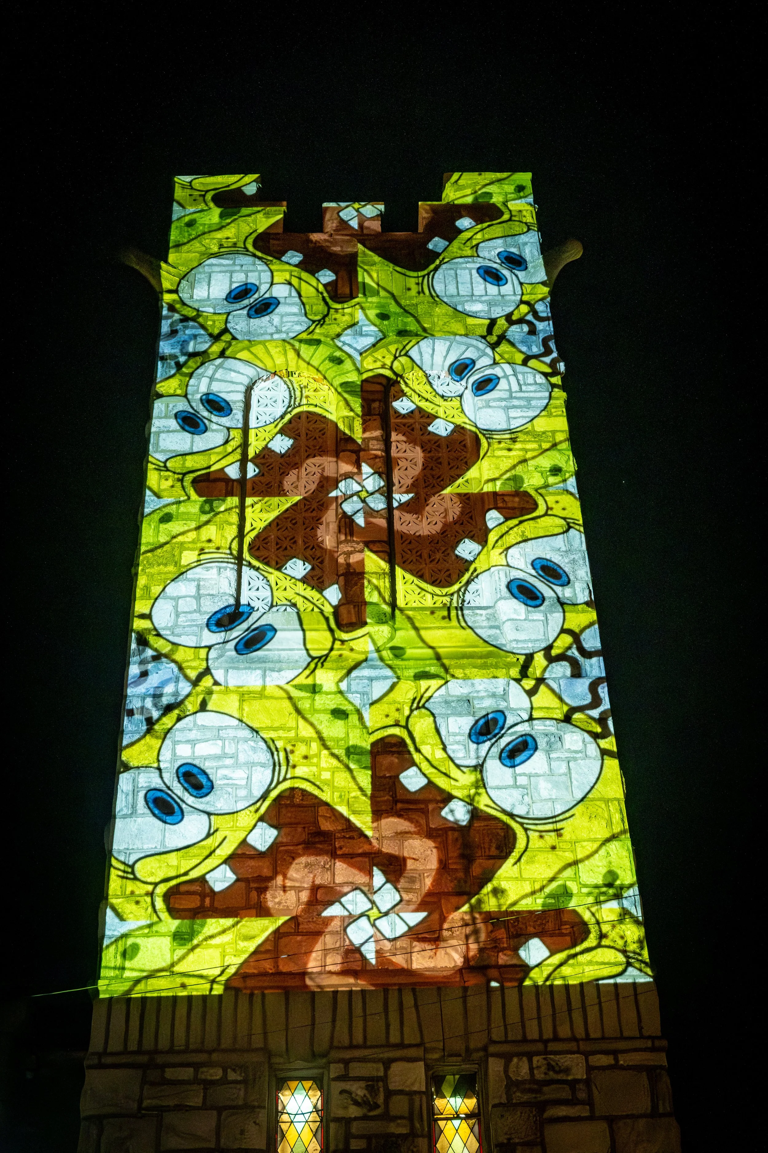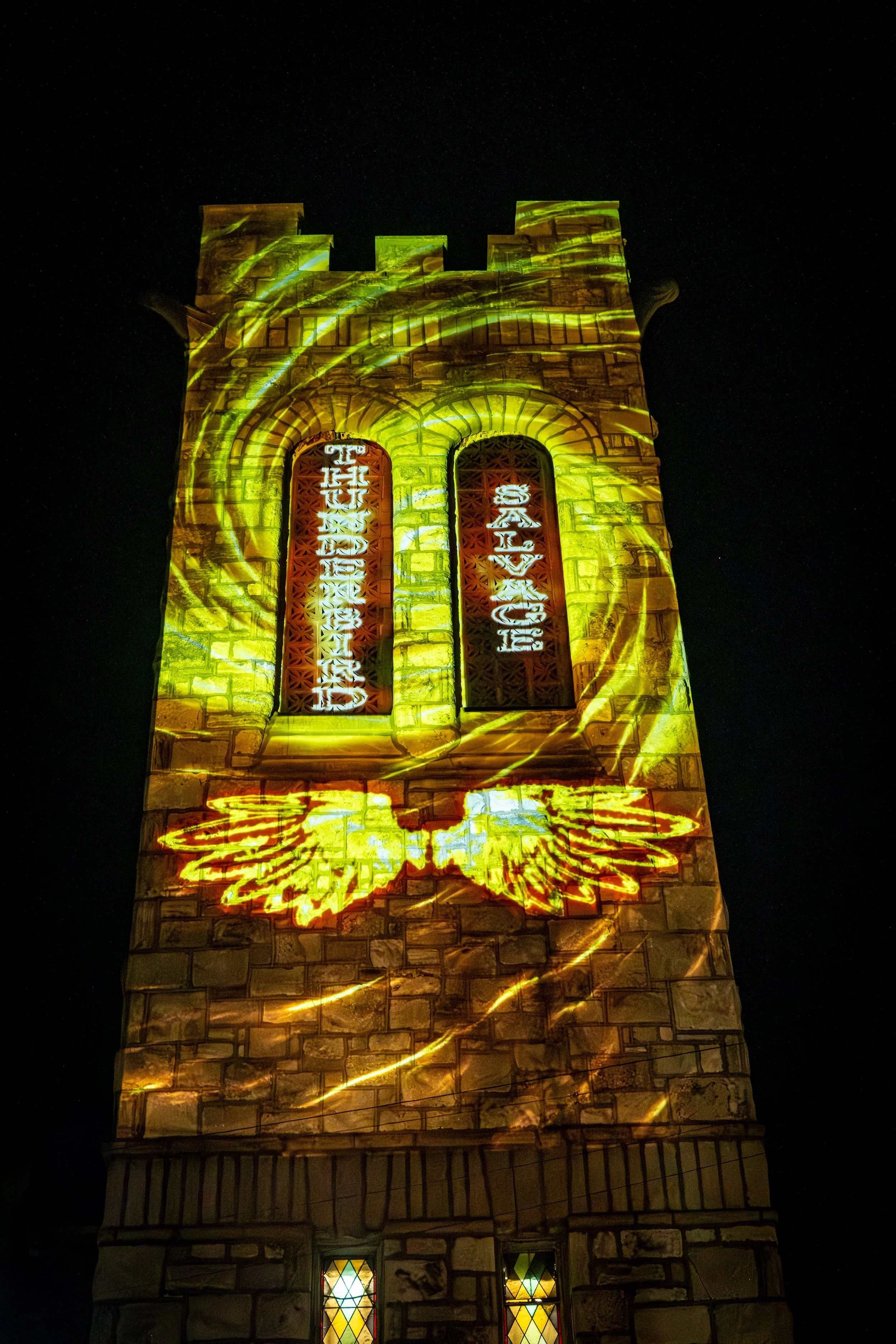 10th Floor Productions projected on the tower of the Thunderbird Salvage building with a montage of films, video game speed runs, cartoons, religious symbols, nature and local sports teams.