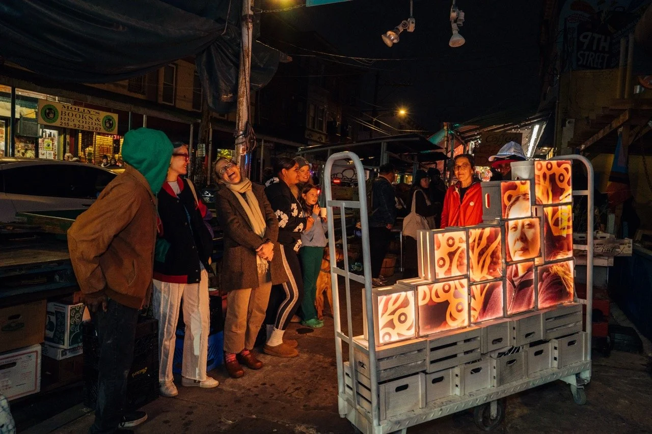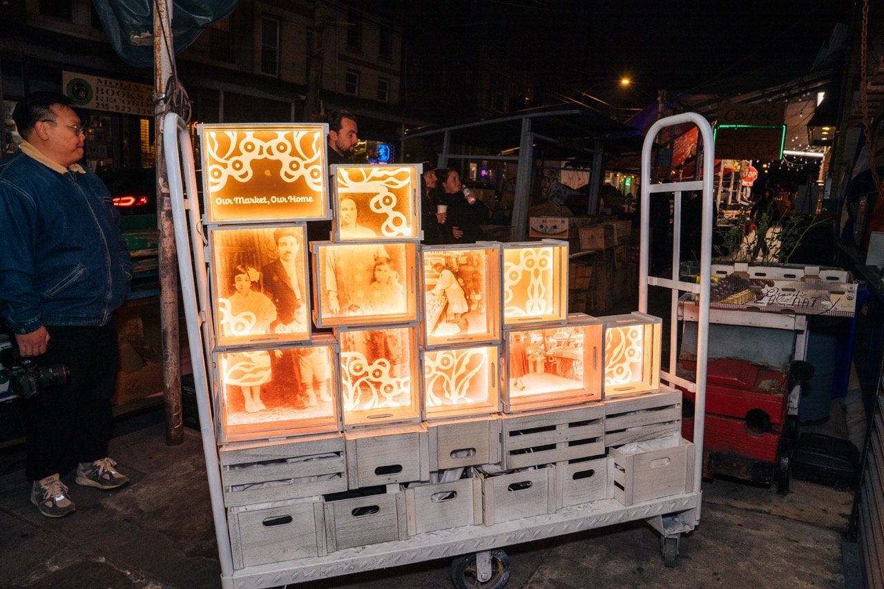 Hosted by Our Market, a community-centered public art revitalization project, the celebration debuted a powerful new 30-foot-tall mural by renowned artist Michelle Angela Ortiz. as well as light installations that highlighted community stories throughout the Market including radiating produce scales, glowing light boxes, a moveable illuminated push cart, and a large three-wall projection designed to bring the voices, resilience, and traditions of Market workers into the public space.